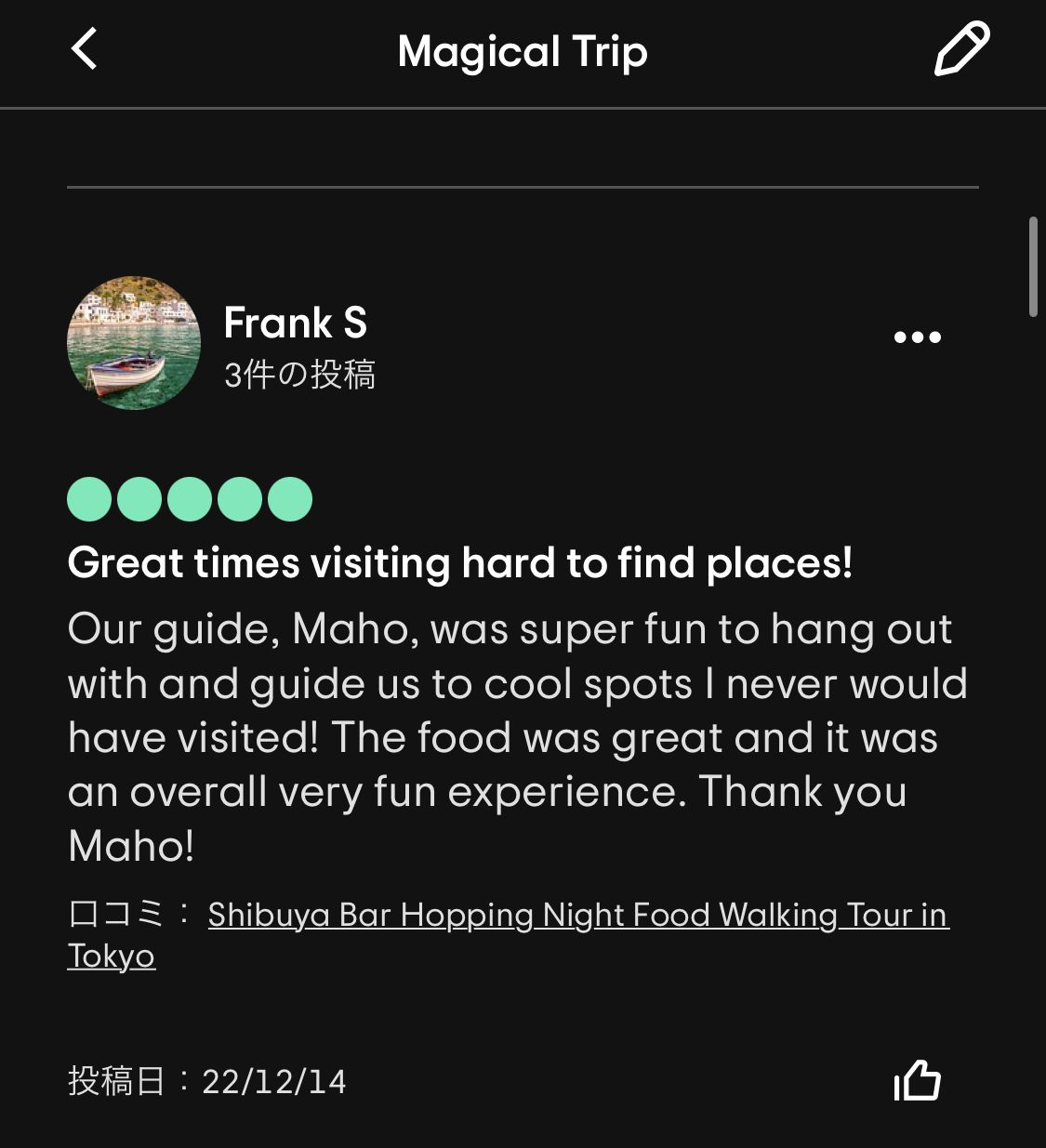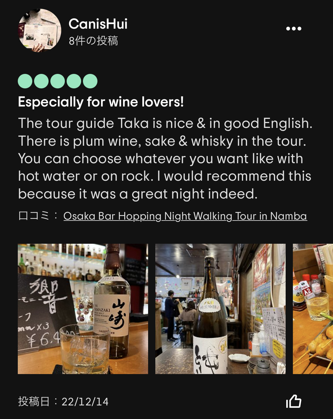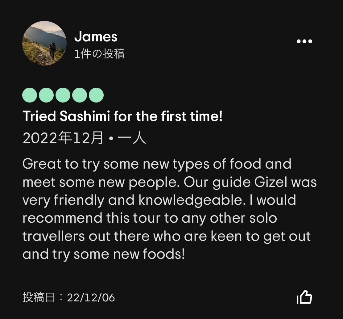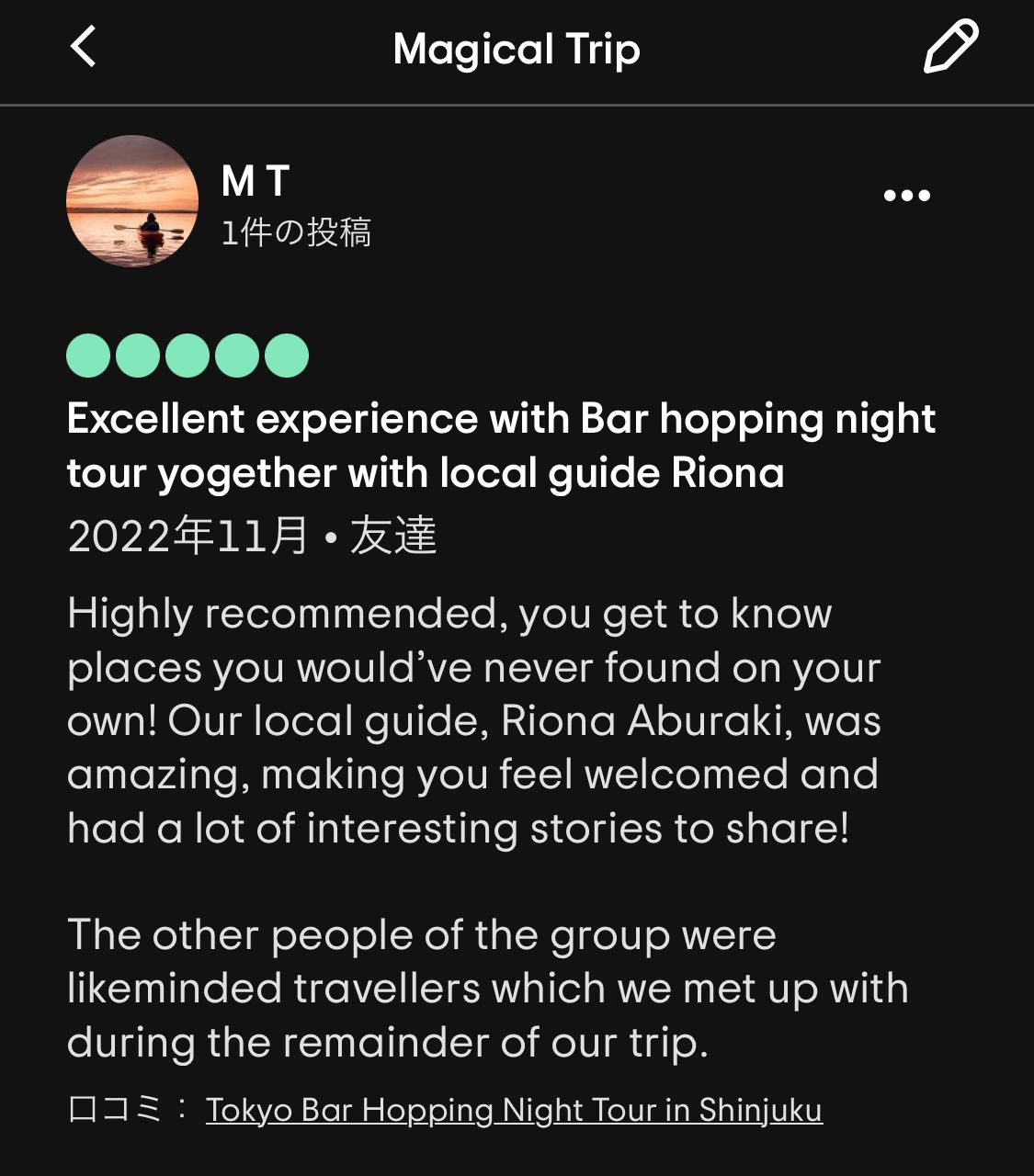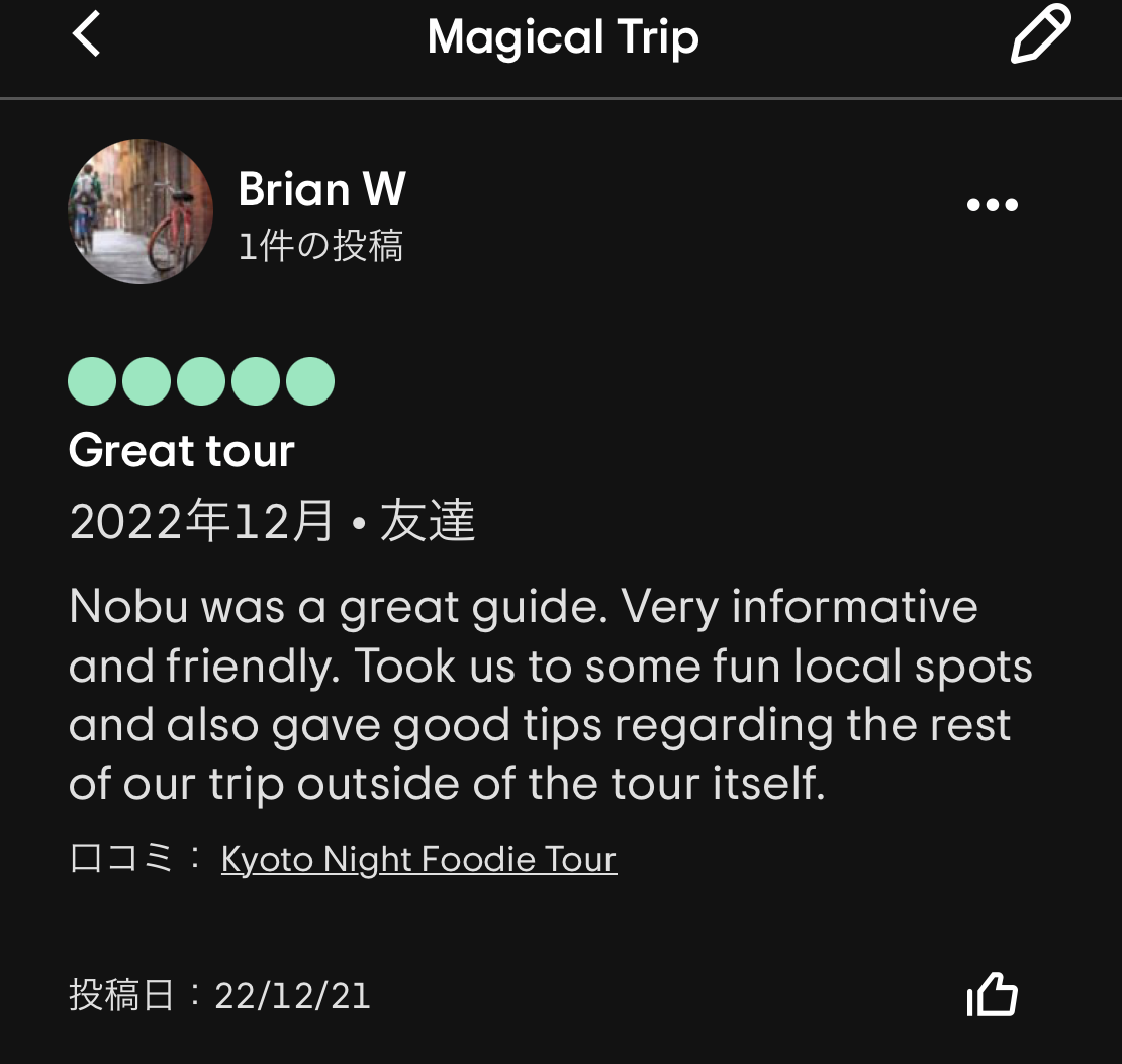 個人的には、Yoichiさんが渋谷のBar hopping tourを数年ぶりにガイドした際に、ゲストに隠れてひっそりと「これだよー」とマジトリツアーの再開に涙を流したストーリーが特に印象的でした😢有難うございます。